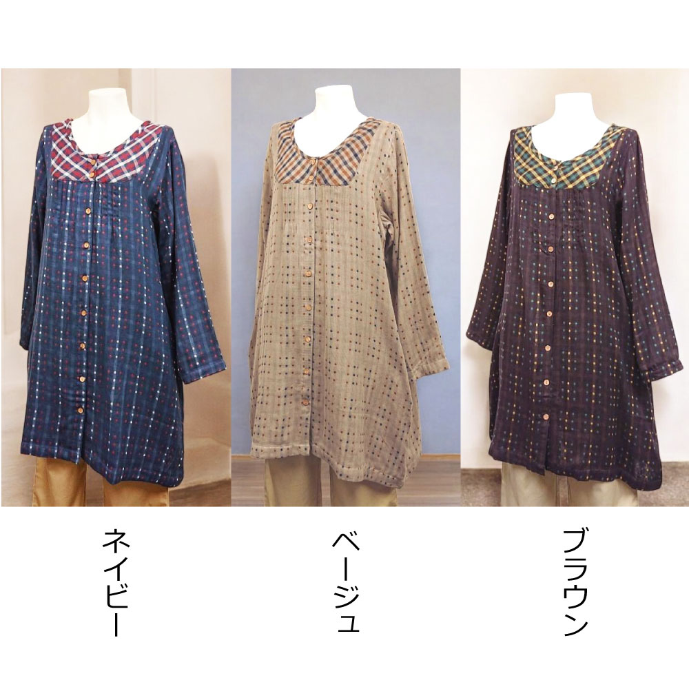 春 初夏 晩夏 秋口 秋 レディース ワンピ 羽織 トップス カジュアル ふんわり コットン 綿 ナチュラル 自然 自然素材 天然素材 インド アジアン ふはく フハク 長袖 おうち 普段着 青 紺 茶色 30代 40代 50代 60代 70代 安い プチプラ