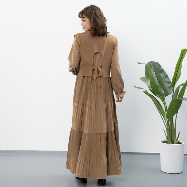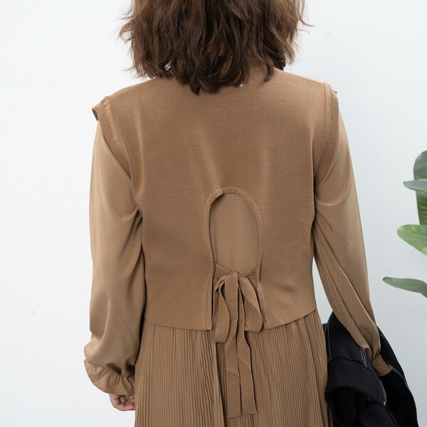 これひとつでレイヤードスタイルが完成する、ニットベスト✕プリーツワンピースのセットです。
