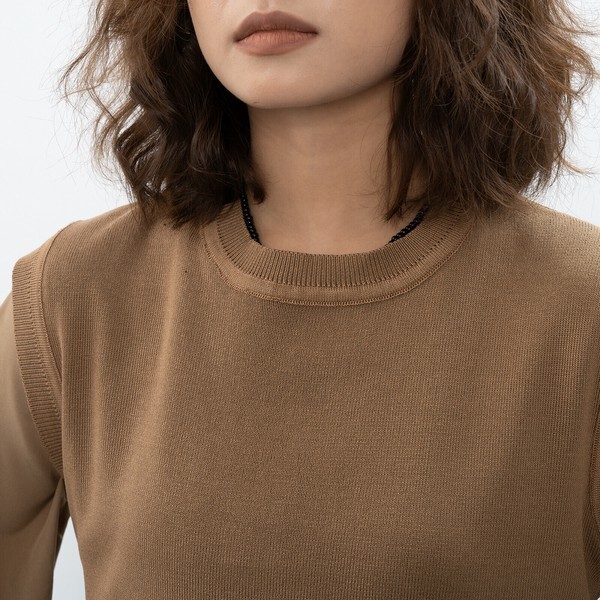 ベストは薄手ニット、ワンピースはマットな艶とややハリのある生地感です。