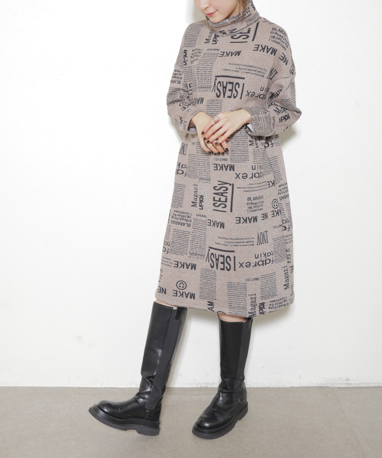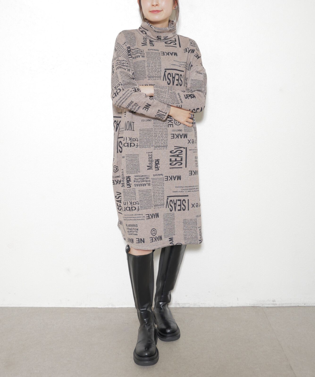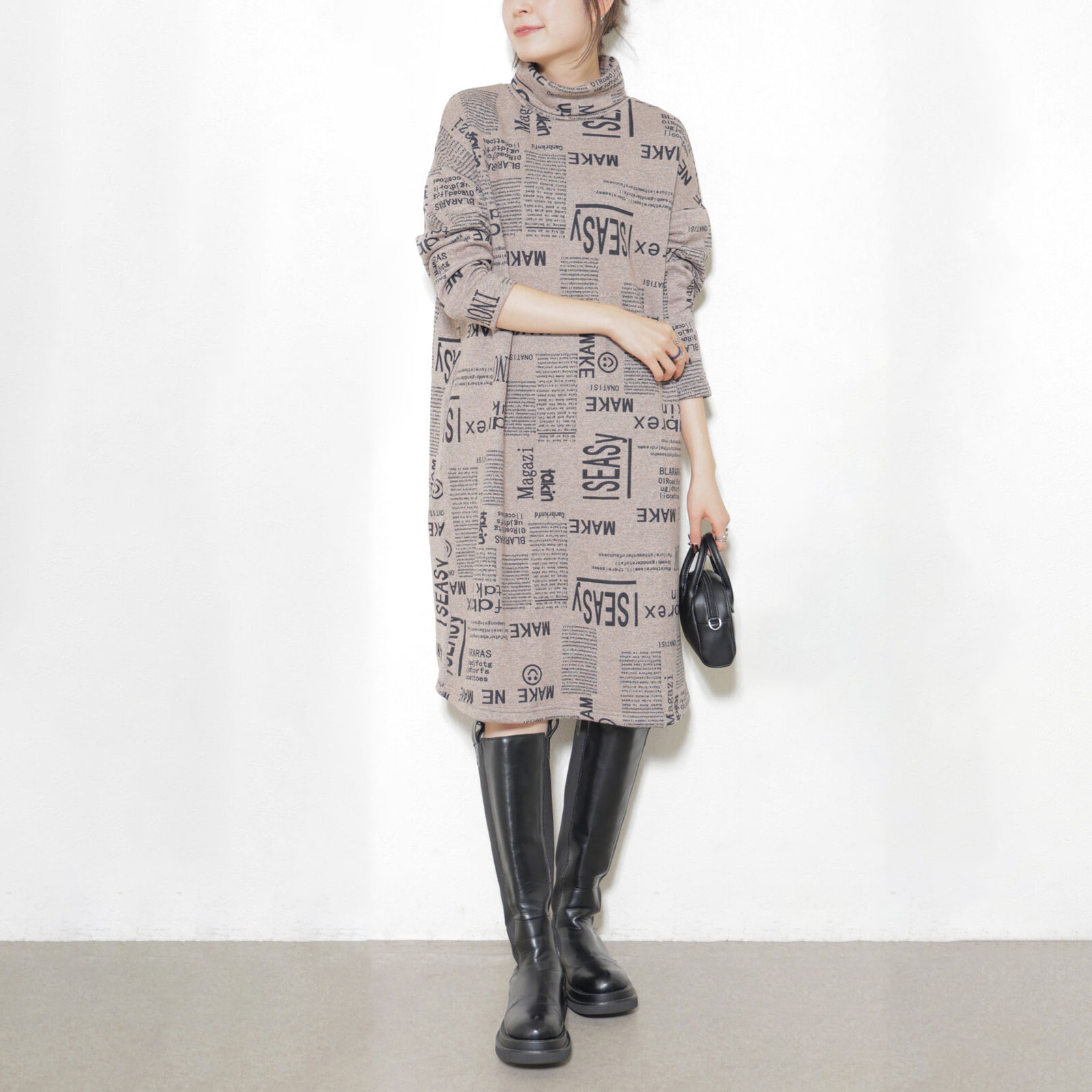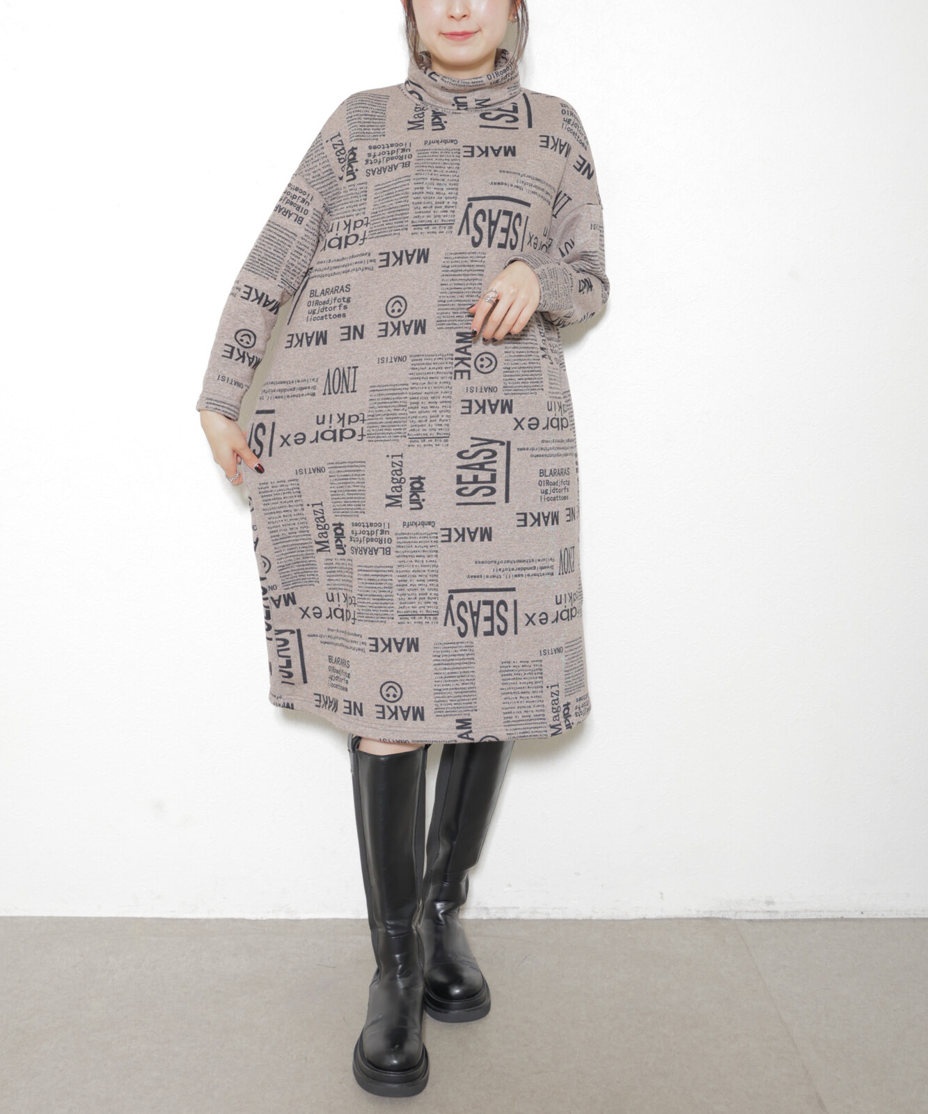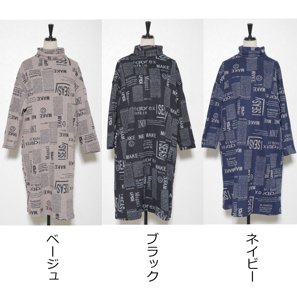 秋 冬 真冬 温か 極暖 レディース ロング 膝下丈 ハイネック タートルネック 普段着 ショッピング お出かけ 女子会 カジュアル おしゃれ 個性 大人 起毛 雑誌柄 新聞柄 M L グレージュ 紺 黒 30代 40代 50代 60代 70代 ハナハナ hanahana 安い 激安 プチプラ