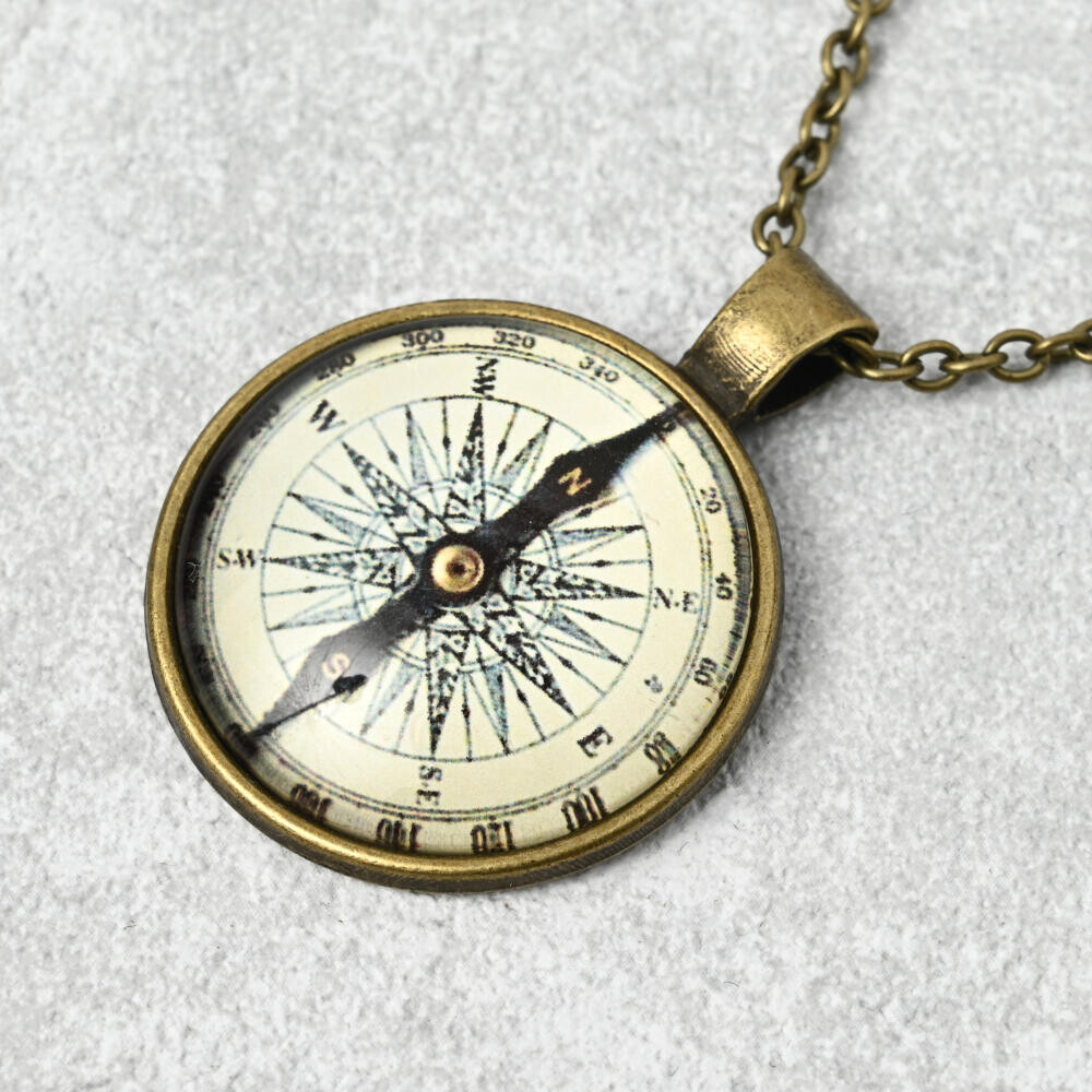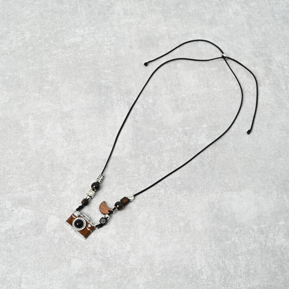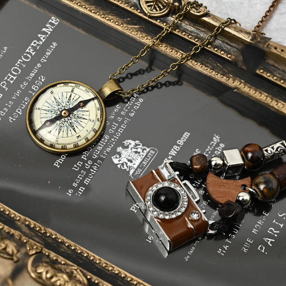 方位磁石風と銀塩カメラ風のペンダントトップが郷愁を誘います。
