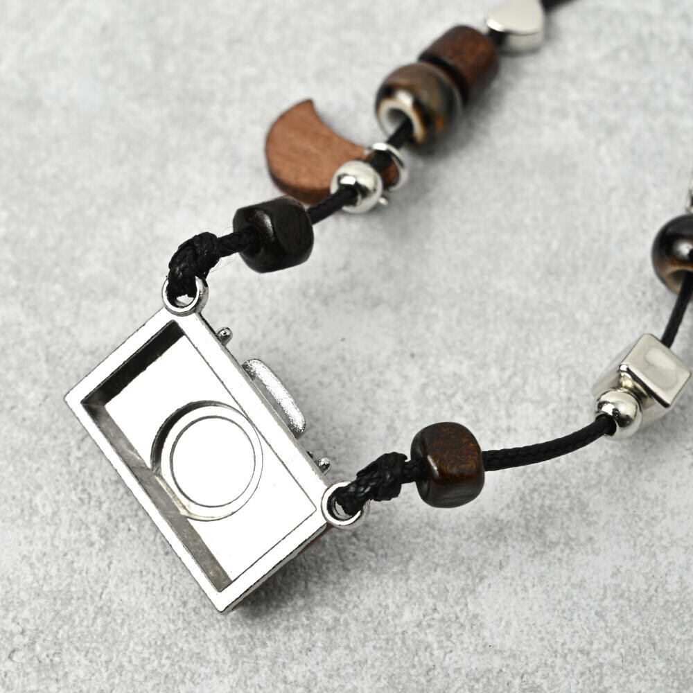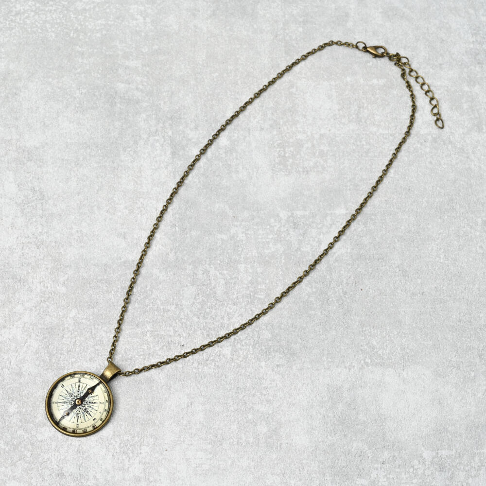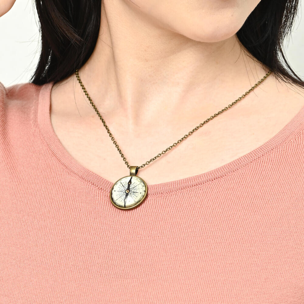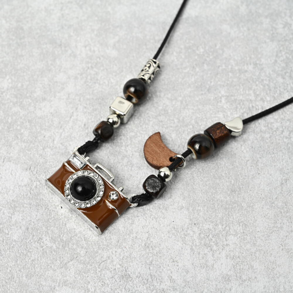 方位磁石風と銀塩カメラ風のペンダントトップが郷愁を誘います。