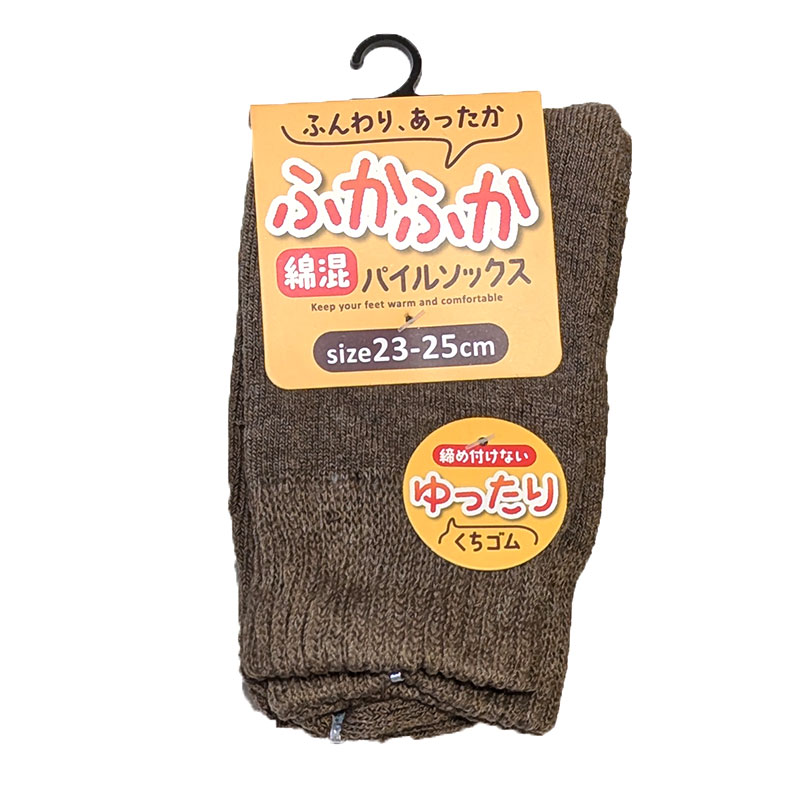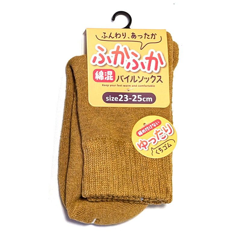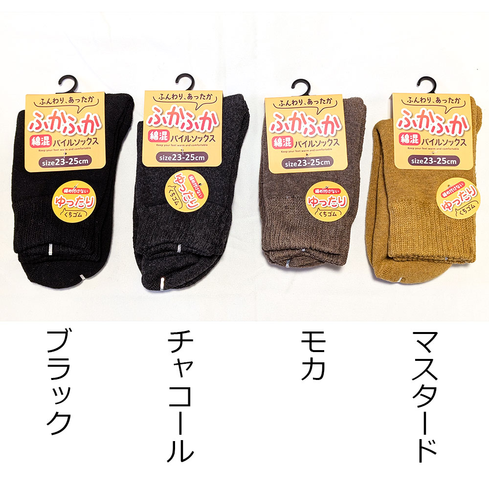良くのびるパイル編みとゆったり口ゴムで、秋冬の足元が快適です。