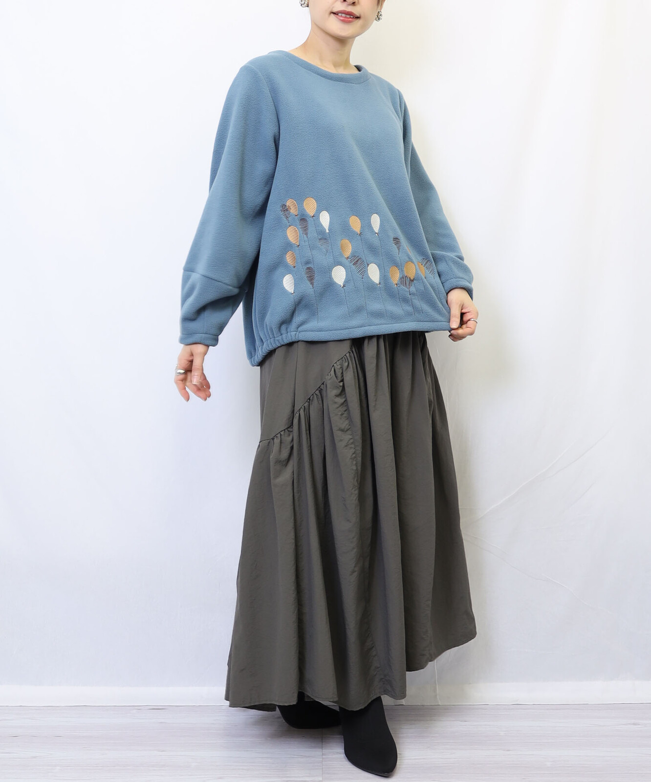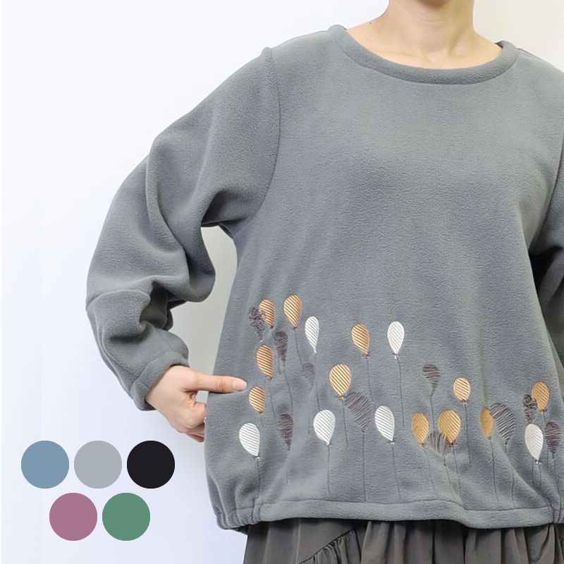 秋 冬 レディース カジュアル トップス Tシャツ カットソー 起毛 カジュアル ナチュラル おうち 普段着 ホームウェア 北欧 丸首 長袖 無地 エンブロイダリー 黒 青 緑 灰色 紫 Mサイズ Lサイズ ゆったり 10代 20代 30代 40代 50代 60代 70代 安い プチプラ
