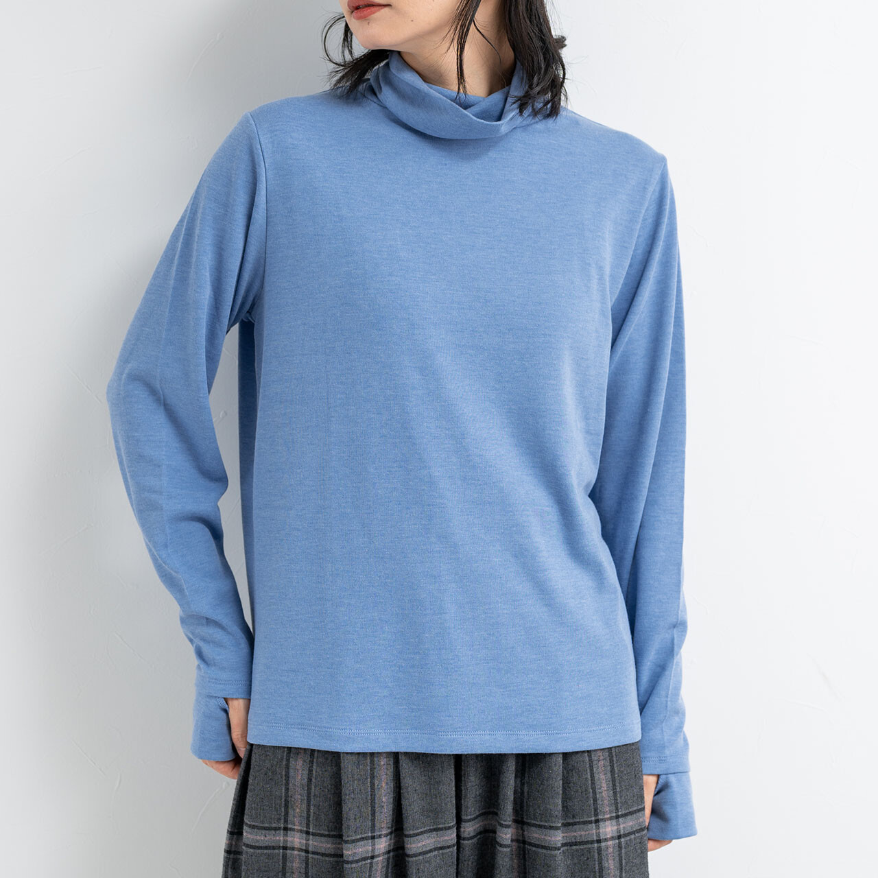 綿混ポリエステルの杢調スムース生地が柔らかな着心地のトップス。
